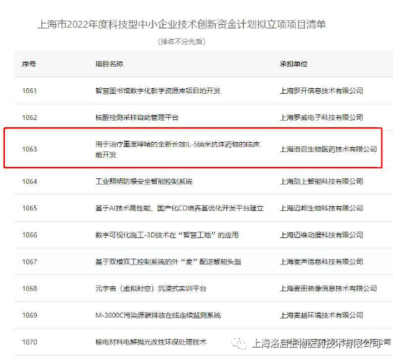 近期,上海市科学技术委员会组织的“上海市2022年度科技型中小企业技术创新资金计划”拟立项项目名单公示完毕,8040威尼斯(中国)生物“用于治疗重度哮喘的全新长效IL-5纳米抗体药物的临床前开发”项目入围。